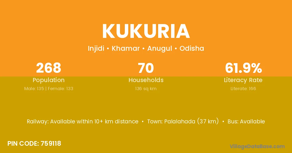 Jaleswar (40 km) is the nearest town to Kukuria village for major economic activities and is located approximately 40 km away.
