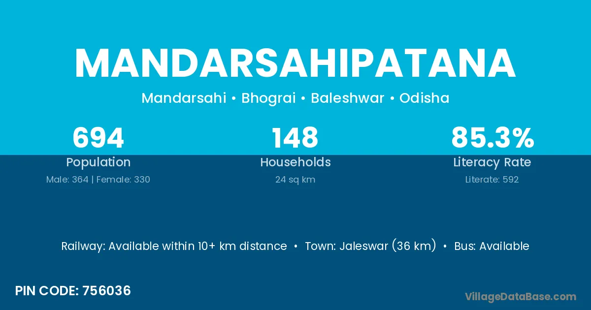 Jaleswar (36 km) is the nearest town to Mandarsahipatana village for major economic activities and is located approximately 36 km away.