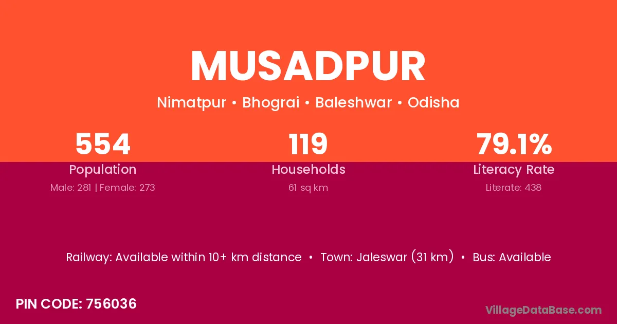 Jaleswar (31 km) is the nearest town to Musadpur village for major economic activities and is located approximately 31 km away.