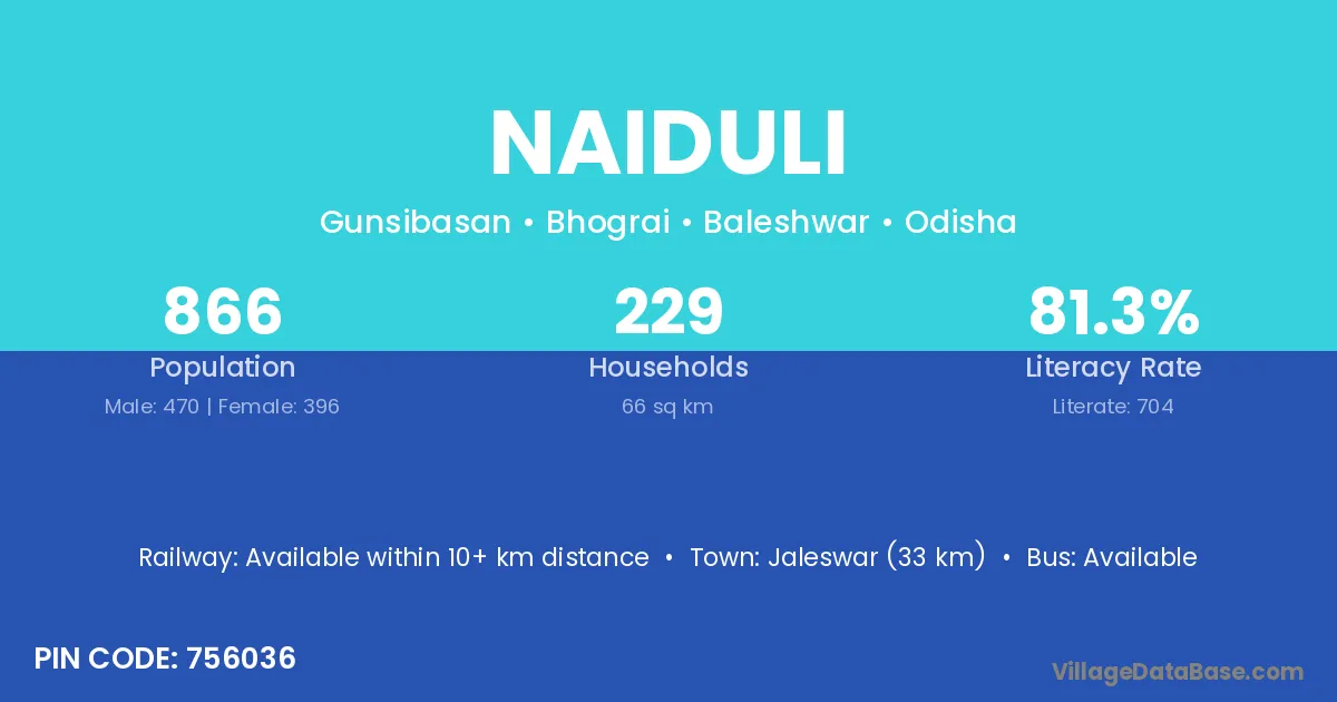 Jaleswar (33 km) is the nearest town to Naiduli village for major economic activities and is located approximately 33 km away.