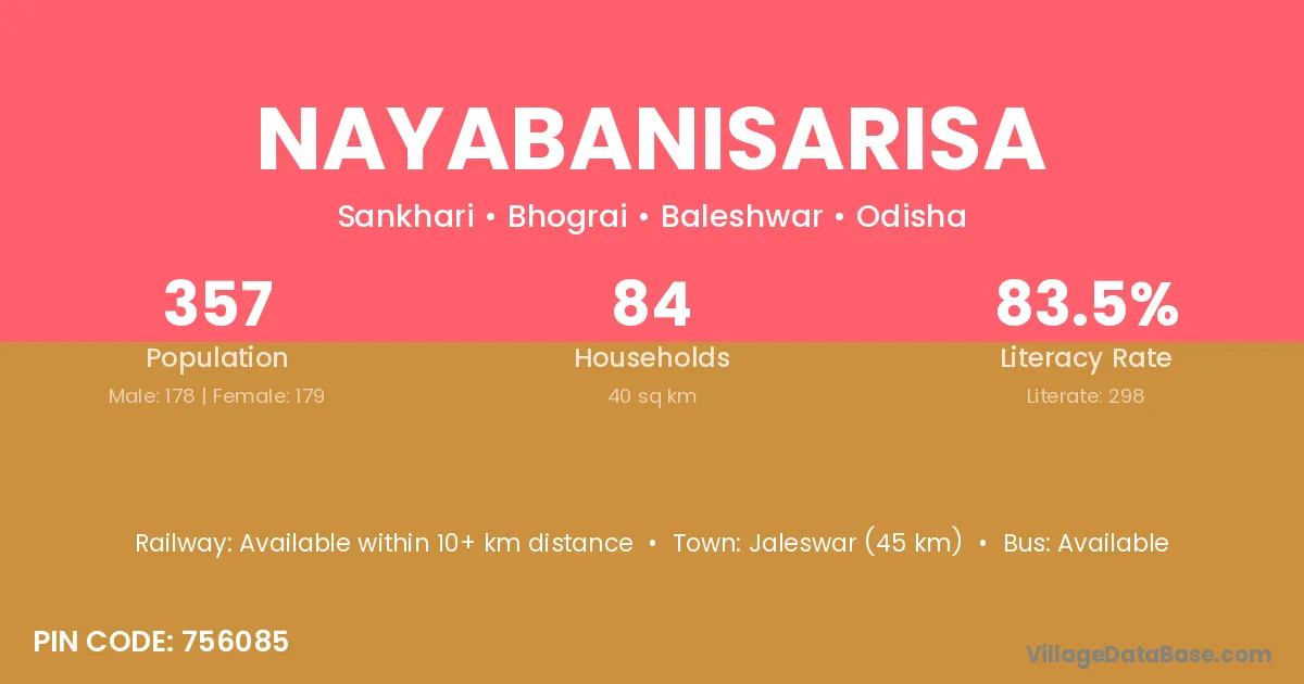 Jaleswar (45 km) is the nearest town to Nayabanisarisa village for major economic activities and is located approximately 45 km away.