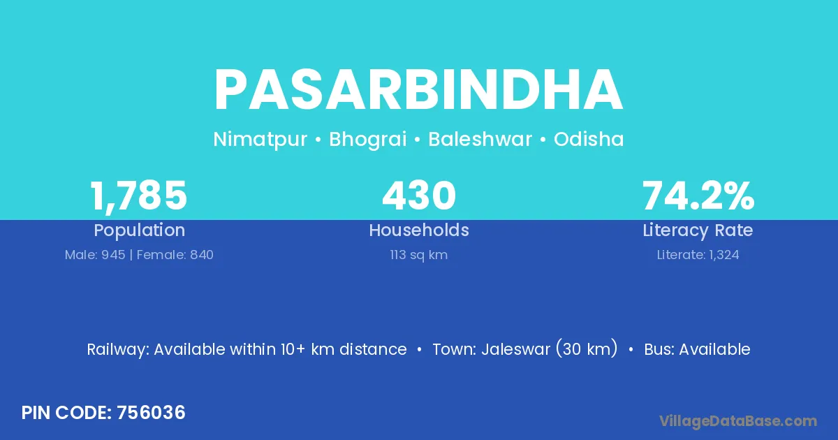 Jaleswar (30 km) is the nearest town to Pasarbindha village for major economic activities and is located approximately 30 km away.