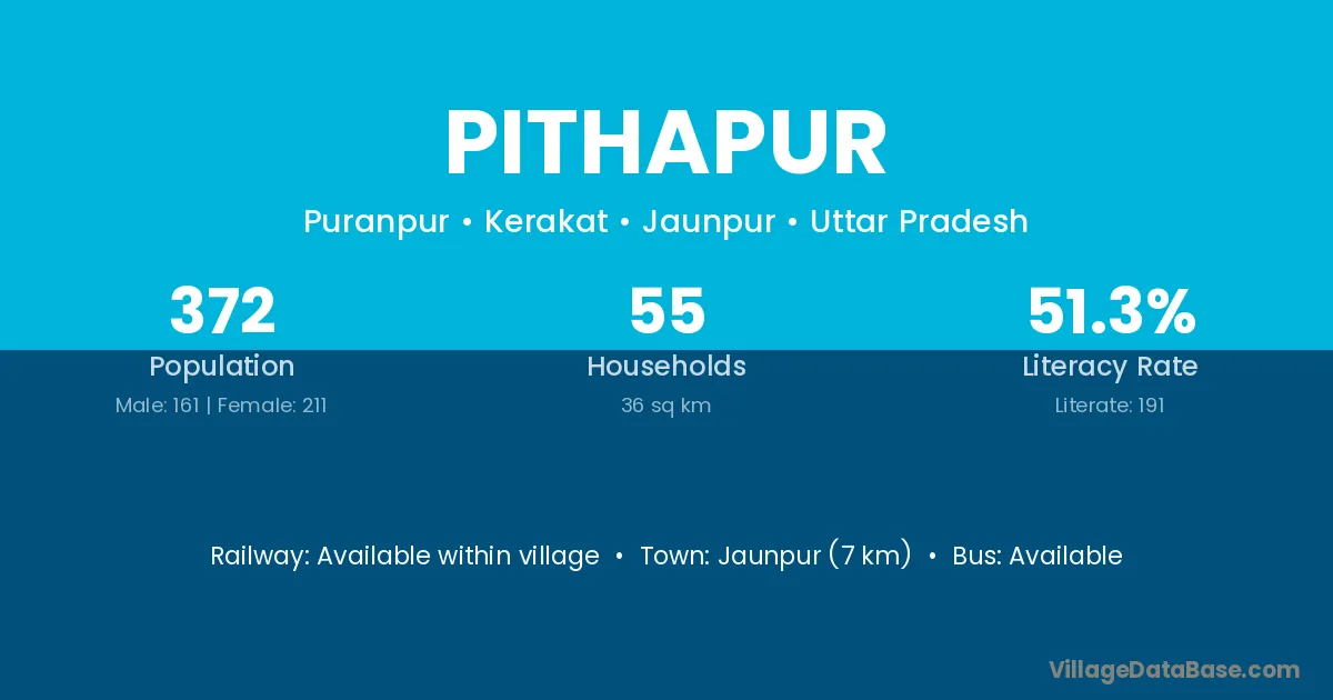 The literacy rate of Pithapur village is 66.88%. Male literacy stands at 73.06% and female literacy at 60.25%.