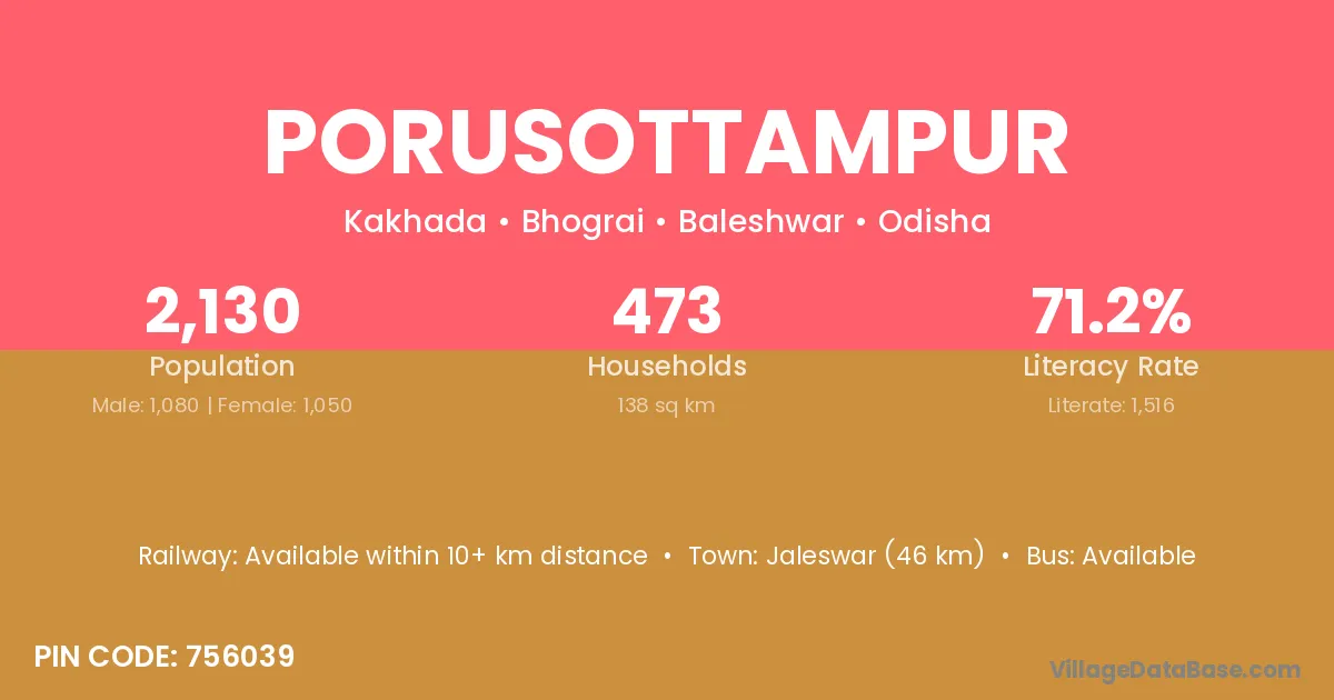 Jaleswar (46 km) is the nearest town to Porusottampur village for major economic activities and is located approximately 46 km away.