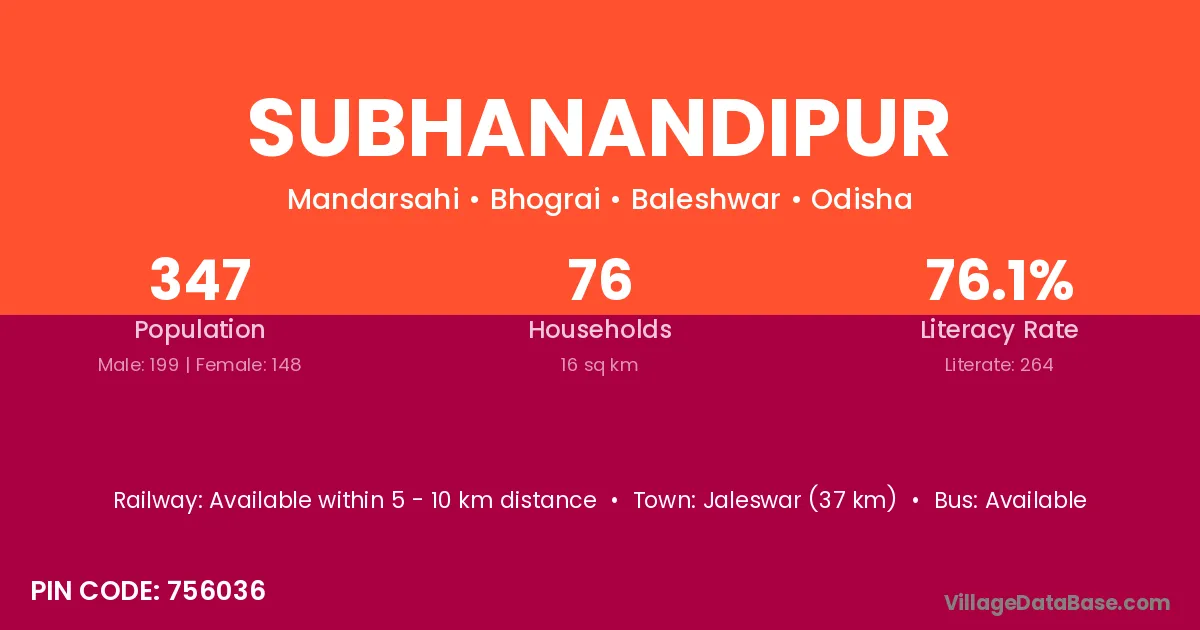 Jaleswar (37 km) is the nearest town to Subhanandipur village for major economic activities and is located approximately 37 km away.