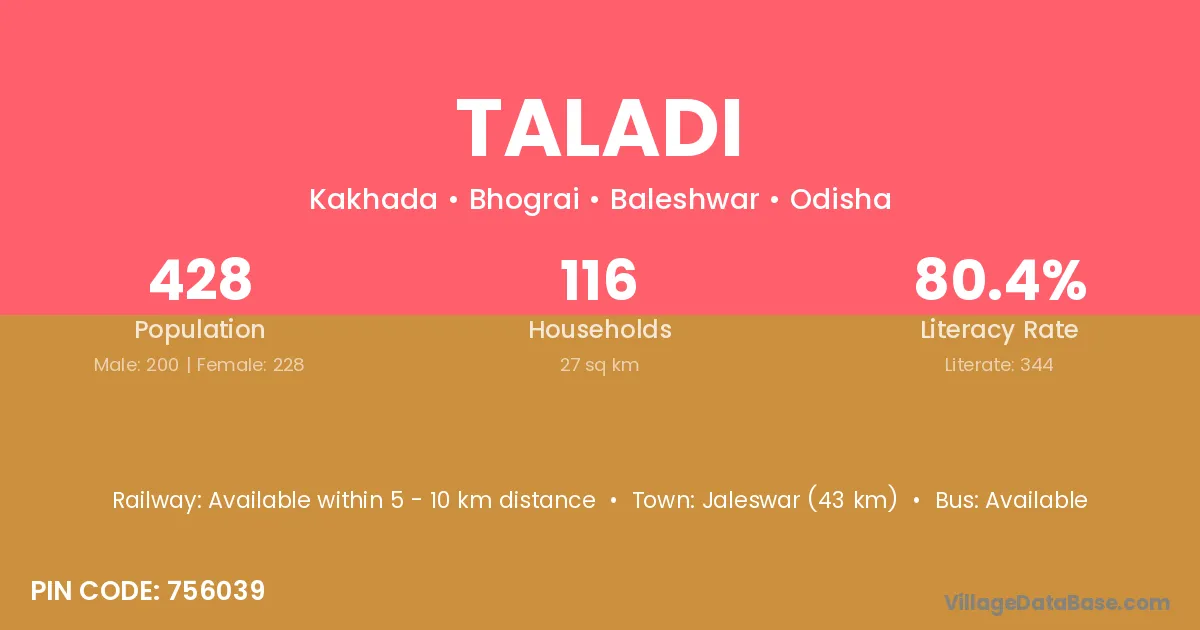 Jaleswar (43 km) is the nearest town to Taladi village for major economic activities and is located approximately 43 km away.