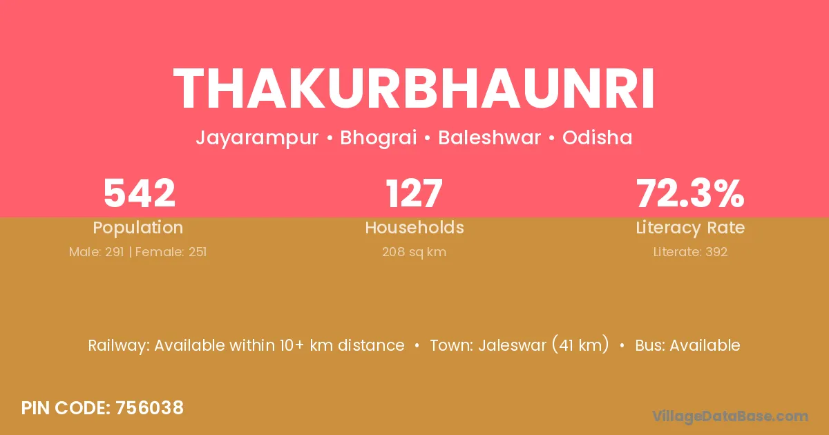 Jaleswar (41 km) is the nearest town to Thakurbhaunri village for major economic activities and is located approximately 41 km away.