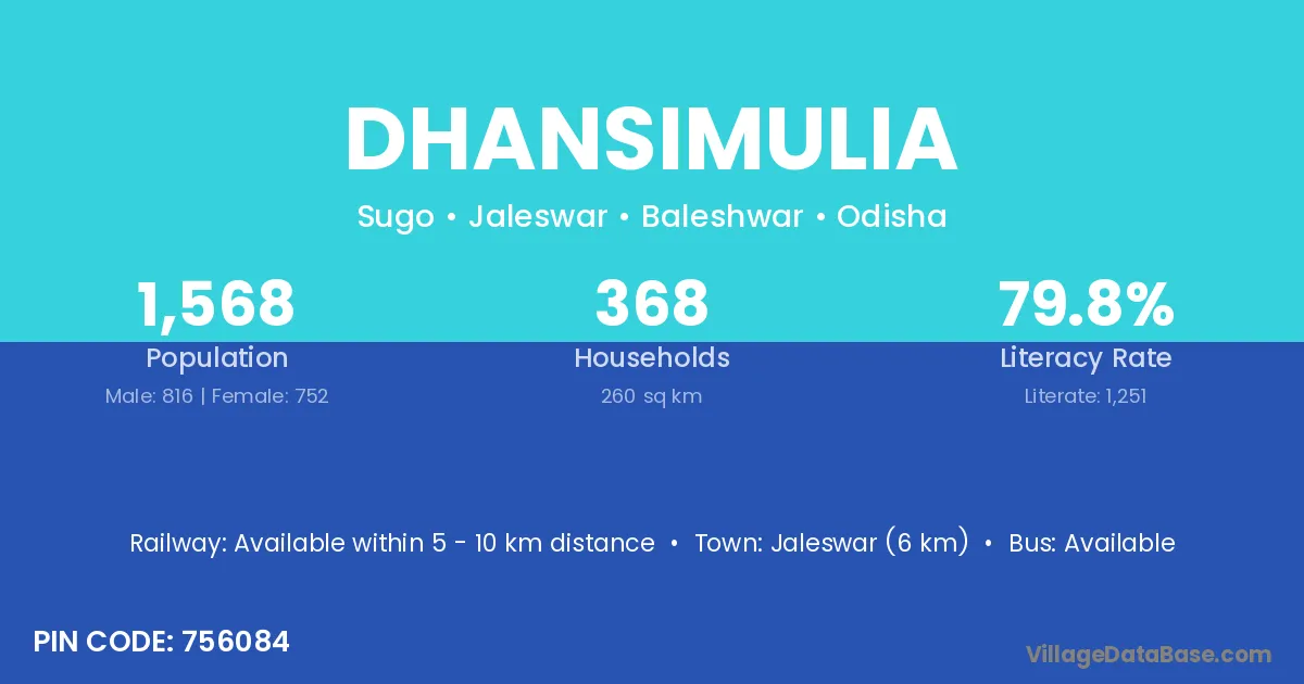 Jaleswar (6 km) is the nearest town to Dhansimulia village for major economic activities and is located approximately 6 km away.