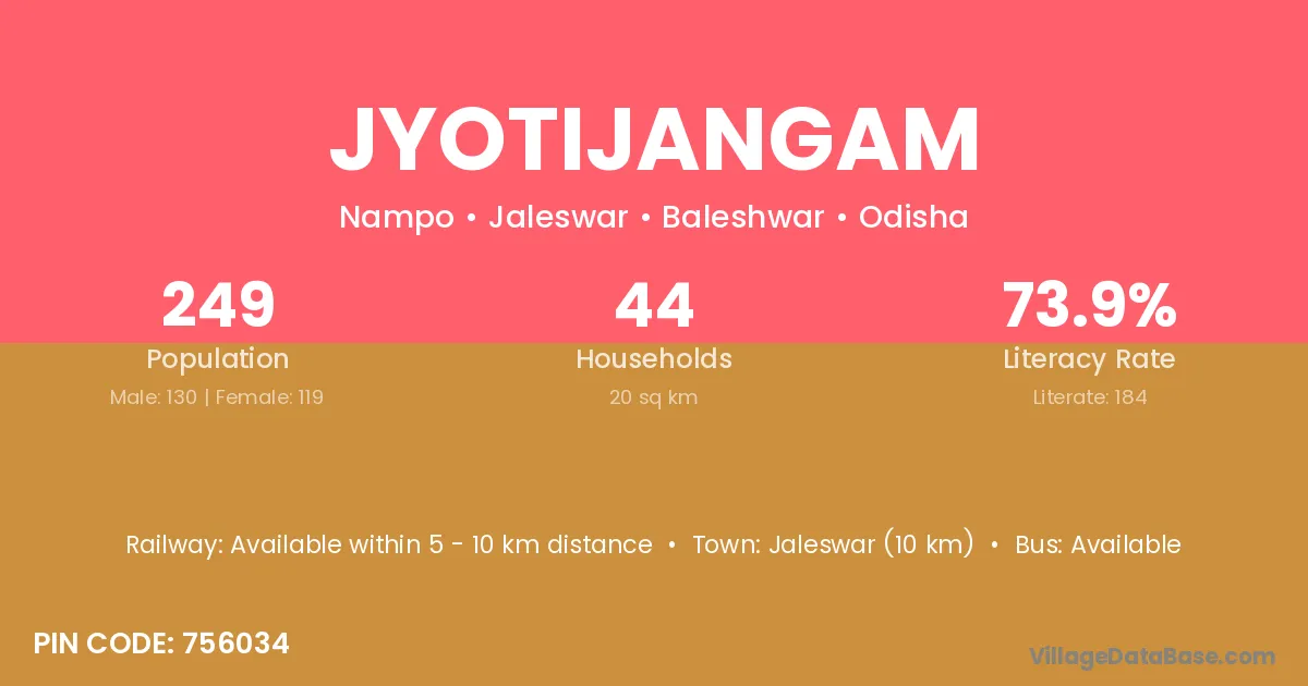 Jaleswar (10 km) is the nearest town to Jyotijangam village for major economic activities and is located approximately 10 km away.