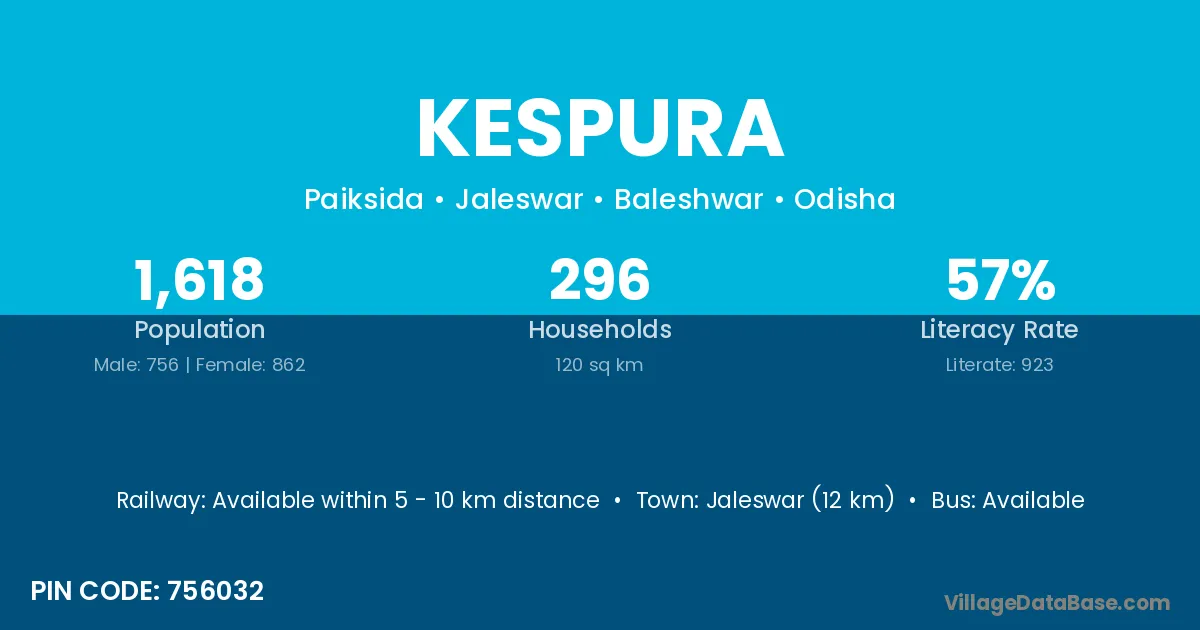 Jaleswar (12 km) is the nearest town to Kespura village for major economic activities and is located approximately 12 km away.