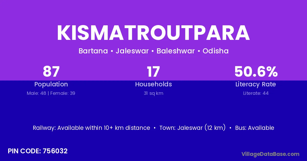 Jaleswar (12 km) is the nearest town to Kismatroutpara village for major economic activities and is located approximately 12 km away.