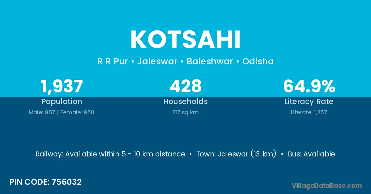 Jaleswar (13 km) is the nearest town to Kotsahi village for major economic activities and is located approximately 13 km away.
