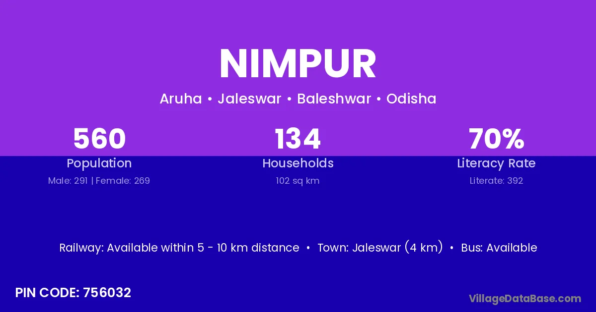 Jaleswar (4 km) is the nearest town to Nimpur village for major economic activities and is located approximately 4 km away.