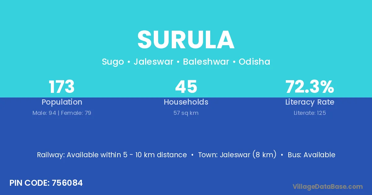 Jaleswar (8 km) is the nearest town to Surula village for major economic activities and is located approximately 8 km away.