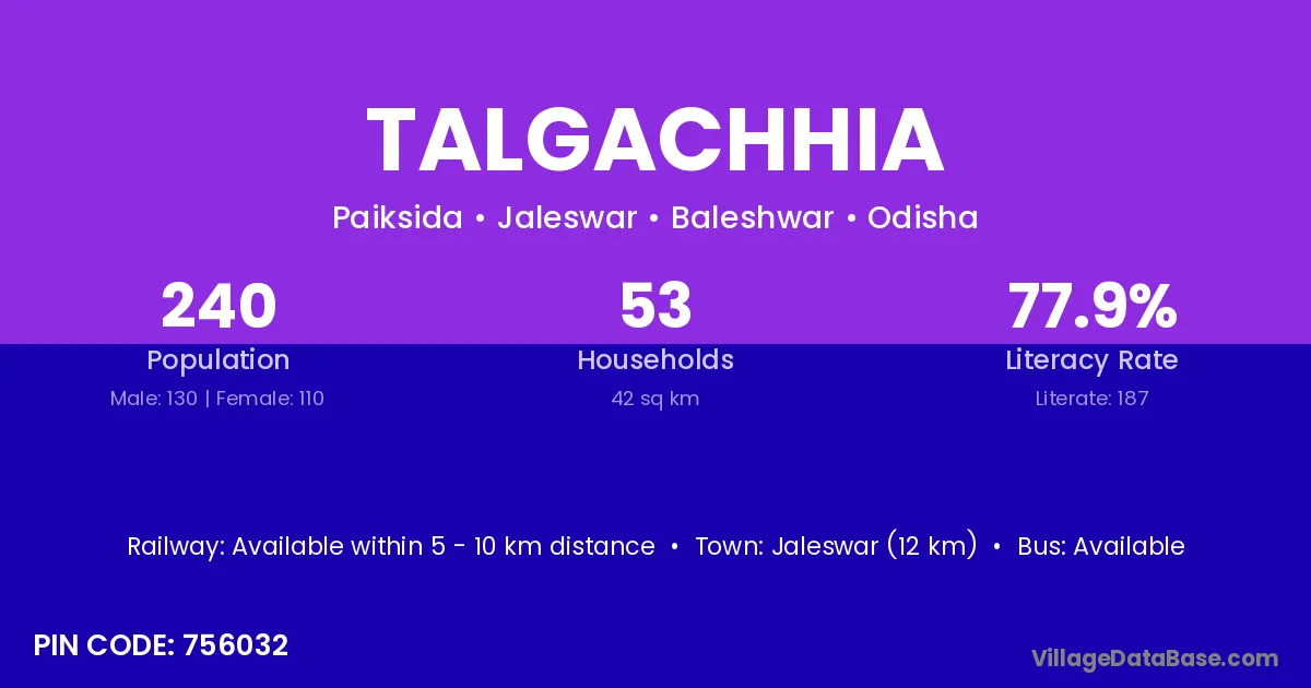Jaleswar (12 km) is the nearest town to Talgachhia village for major economic activities and is located approximately 12 km away.