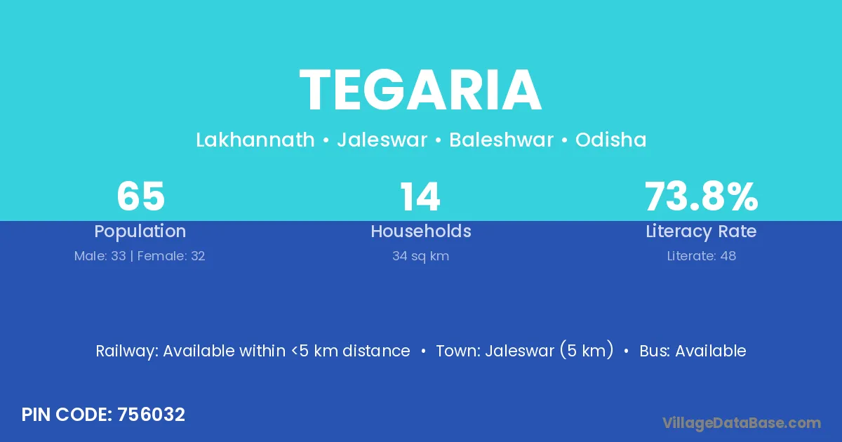 Jaleswar (5 km) is the nearest town to Tegaria village for major economic activities and is located approximately 5 km away.
