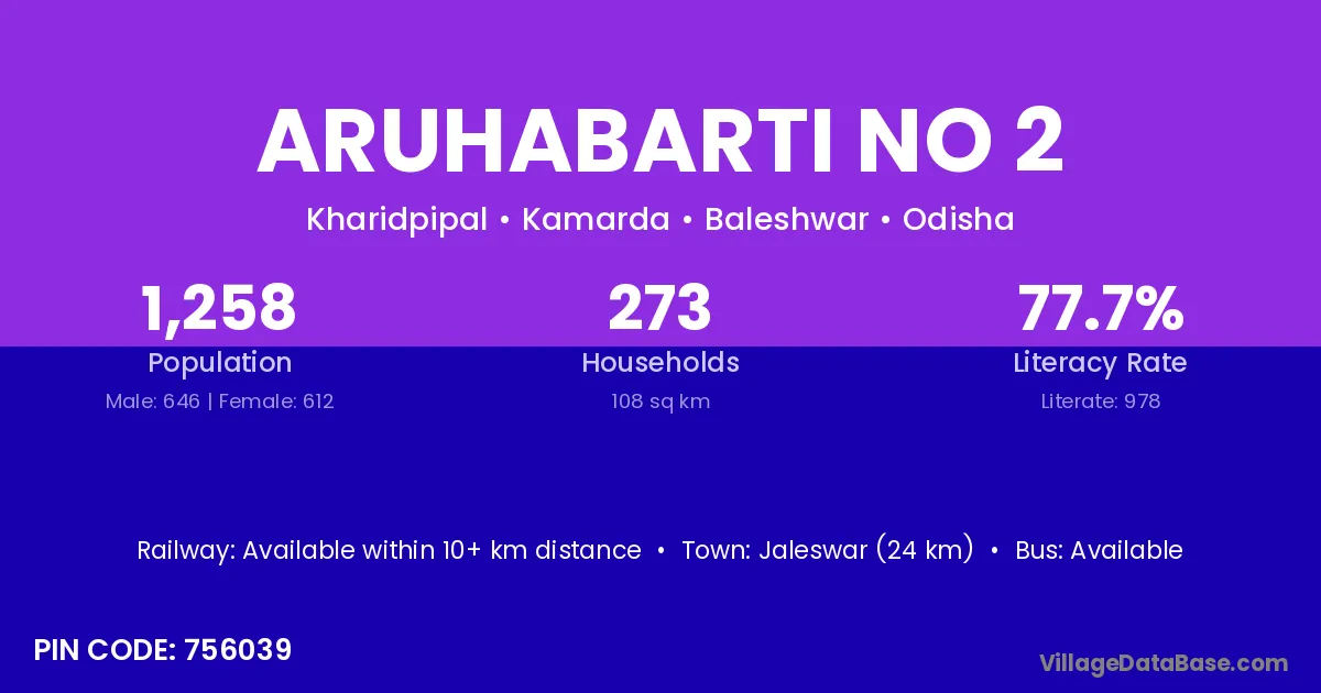 Aruhabarti No 2 village has a total population of 1,258 people, of which 646 are males and 612 are females.