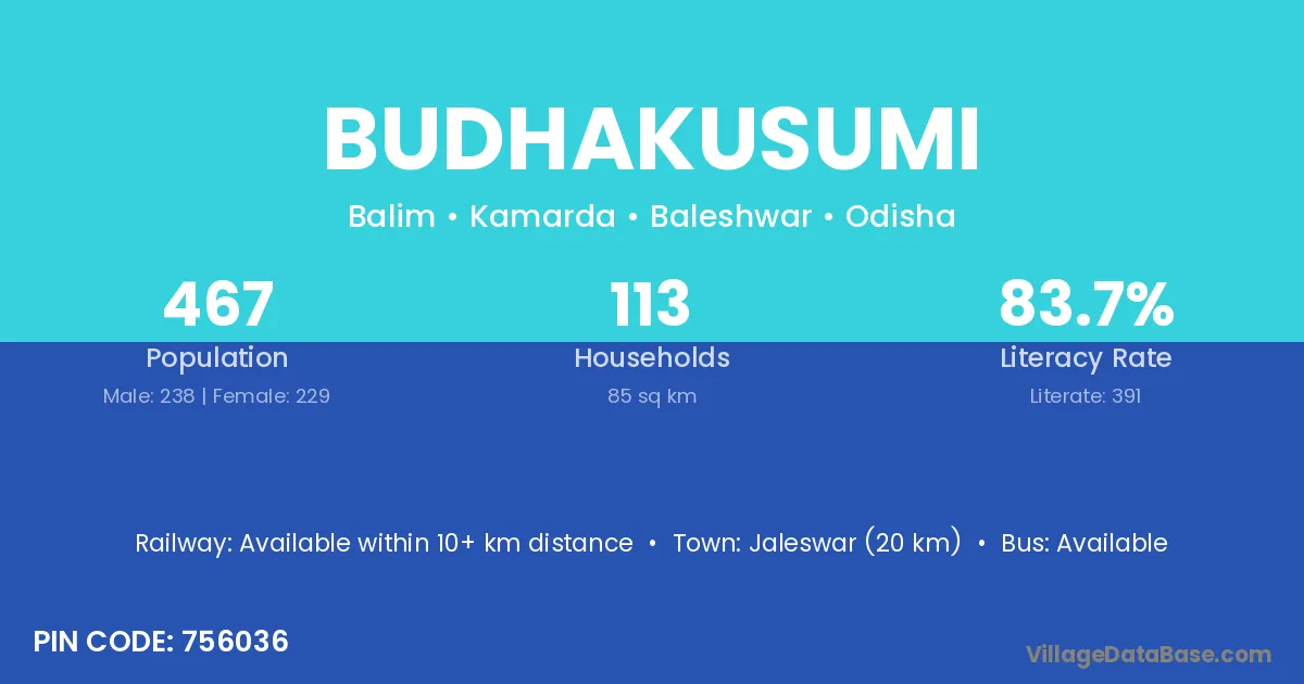 Jaleswar (20 km) is the nearest town to Budhakusumi village for major economic activities and is located approximately 20 km away.
