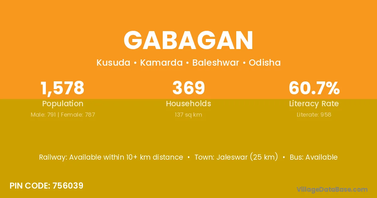Jaleswar (25 km) is the nearest town to Gabagan village for major economic activities and is located approximately 25 km away.