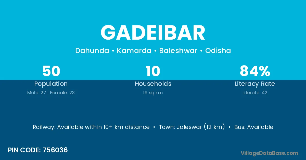 Jaleswar (12 km) is the nearest town to Gadeibar village for major economic activities and is located approximately 12 km away.