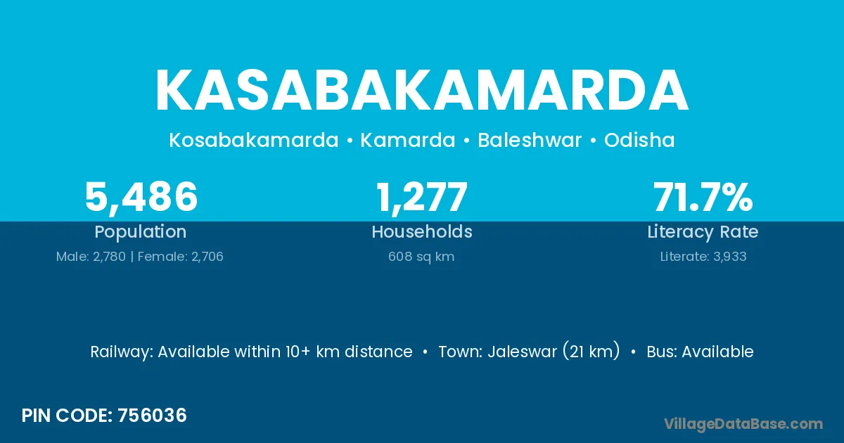 Jaleswar (21 km) is the nearest town to Kasabakamarda village for major economic activities and is located approximately 21 km away.