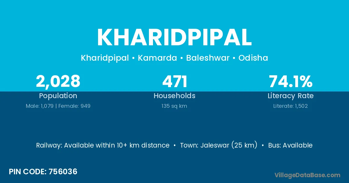 Jaleswar (25 km) is the nearest town to Kharidpipal village for major economic activities and is located approximately 25 km away.