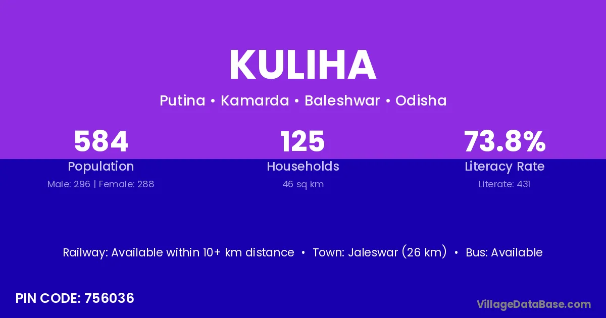 Jaleswar (26 km) is the nearest town to Kuliha village for major economic activities and is located approximately 26 km away.