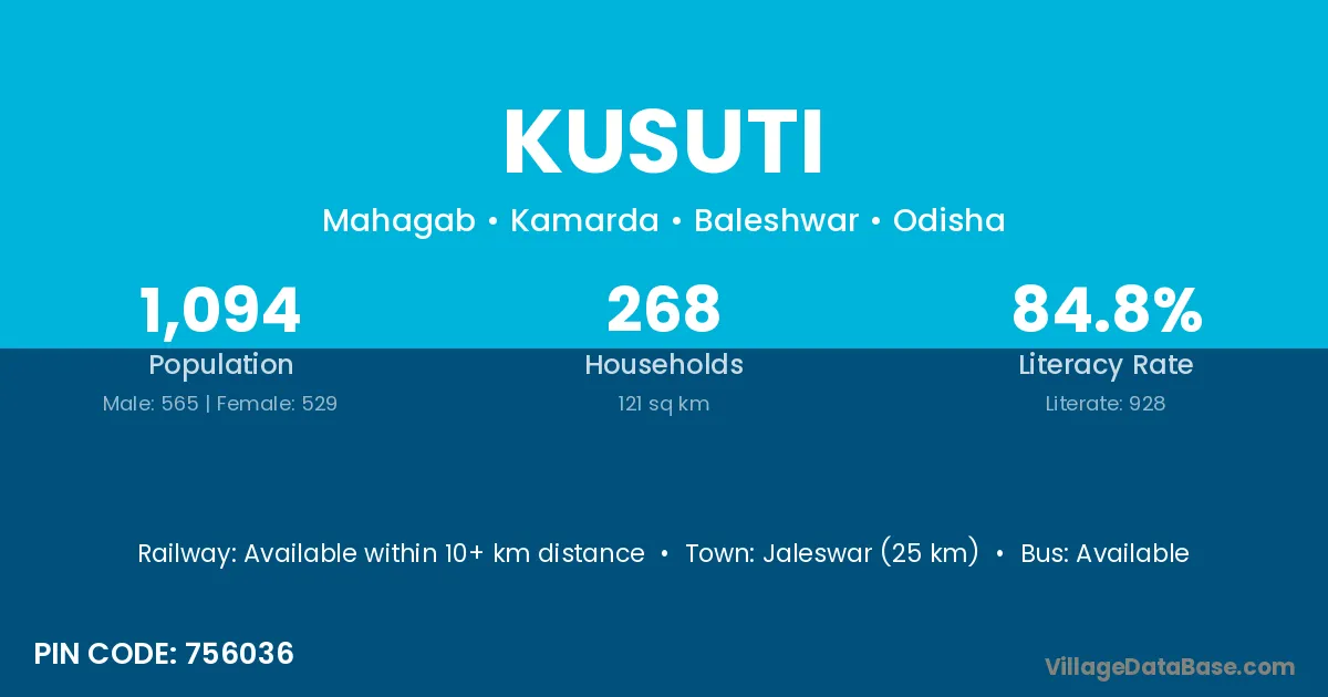 Jaleswar (25 km) is the nearest town to Kusuti village for major economic activities and is located approximately 25 km away.