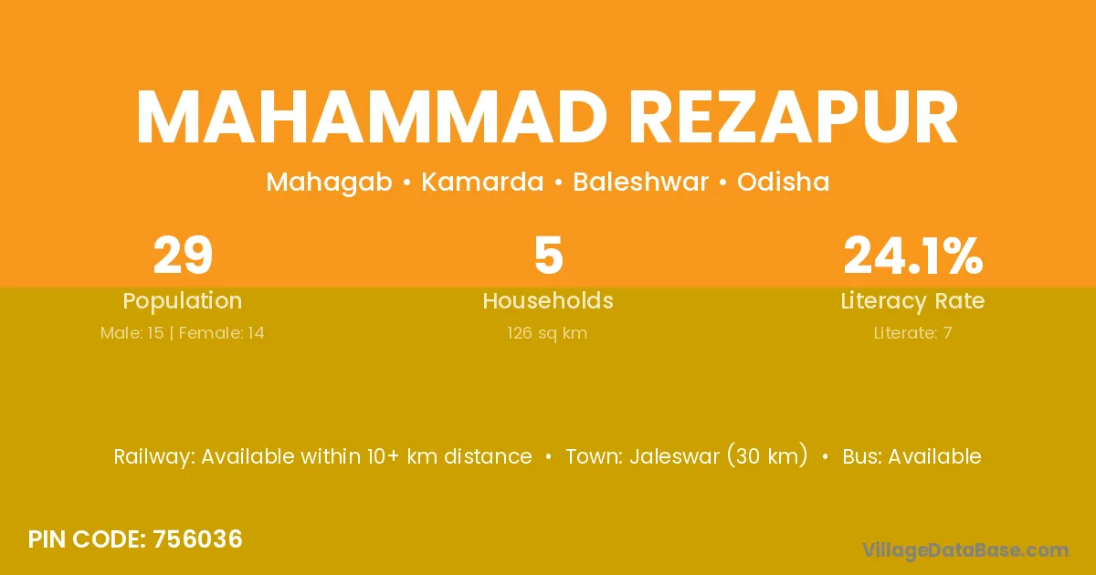 Jaleswar (30 km) is the nearest town to Mahammad Rezapur village for major economic activities and is located approximately 30 km away.