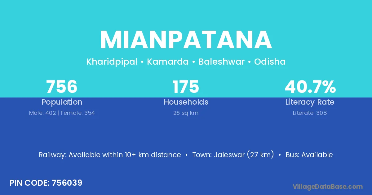 Jaleswar (27 km) is the nearest town to Mianpatana village for major economic activities and is located approximately 27 km away.