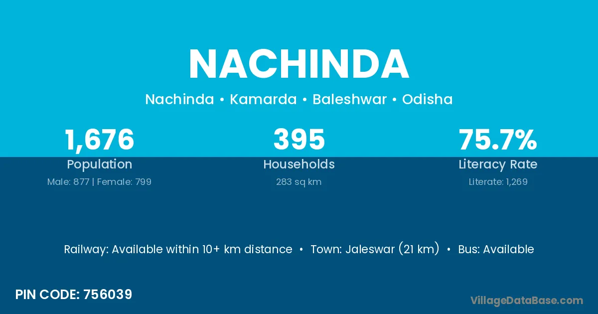 Jaleswar (21 km) is the nearest town to Nachinda village for major economic activities and is located approximately 21 km away.