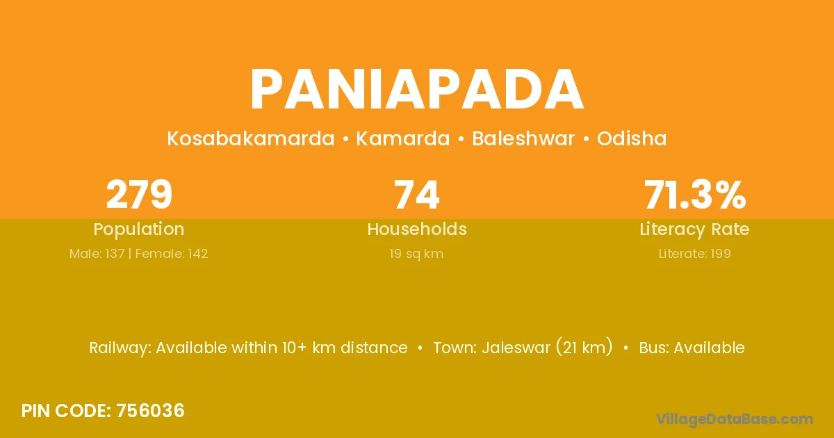 Jaleswar (21 km) is the nearest town to Paniapada village for major economic activities and is located approximately 21 km away.