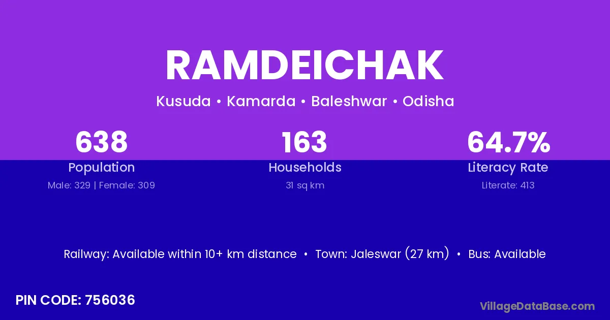 Jaleswar (27 km) is the nearest town to Ramdeichak village for major economic activities and is located approximately 27 km away.