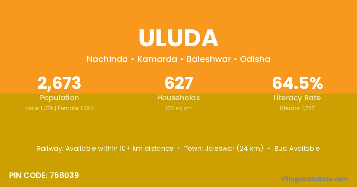 Jaleswar (24 km) is the nearest town to Uluda village for major economic activities and is located approximately 24 km away.