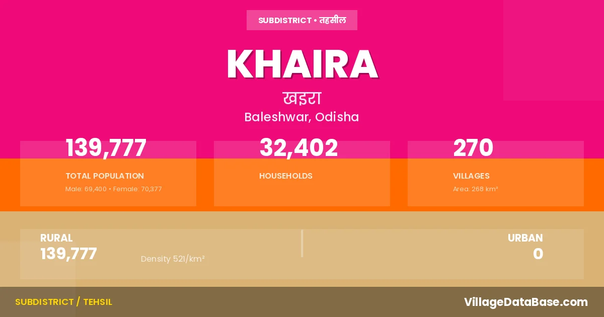 Khaira is a town and Tehsil in the Baleshwar district of the Odisha. In India, a Tehsil is a subdivision of a district responsible for the administration and revenue collection of a specific area within the district. Tehsils play a crucial role in the local governance structure, contributing significantly to the development and administration of their communities.