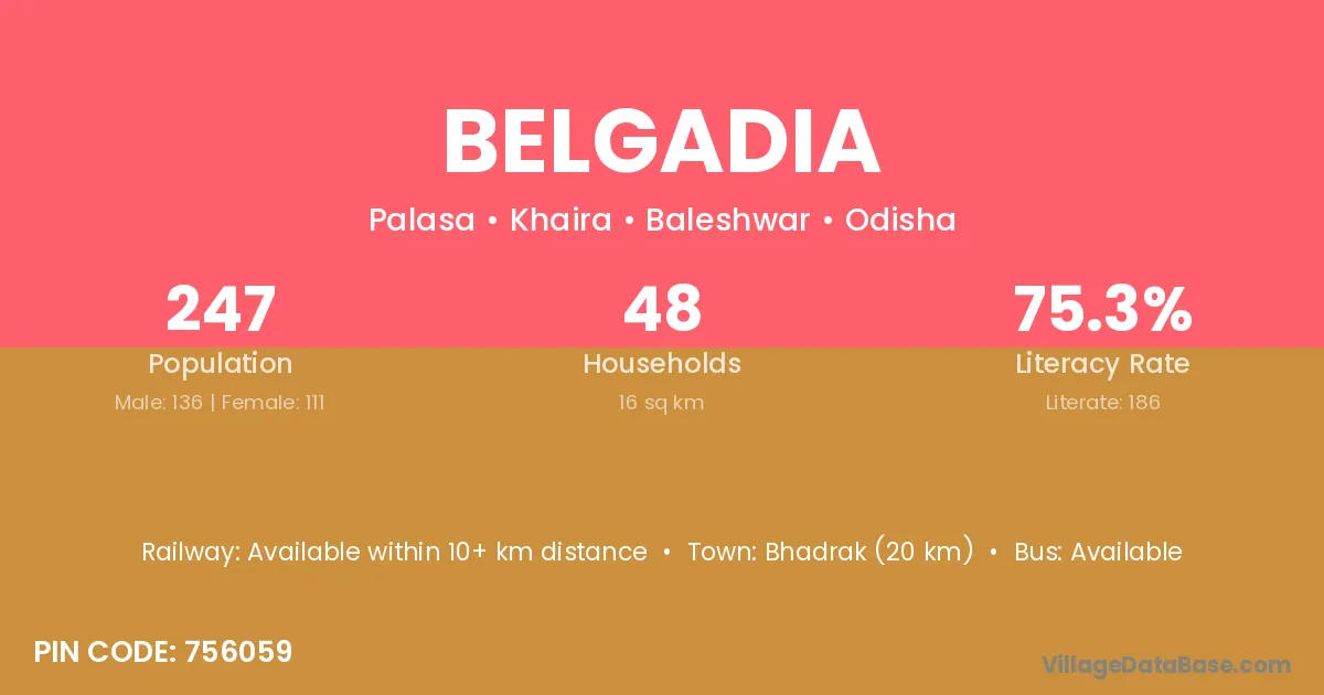 Bhadrak (20 km) is the nearest town to Belgadia village for major economic activities and is located approximately 20 km away.