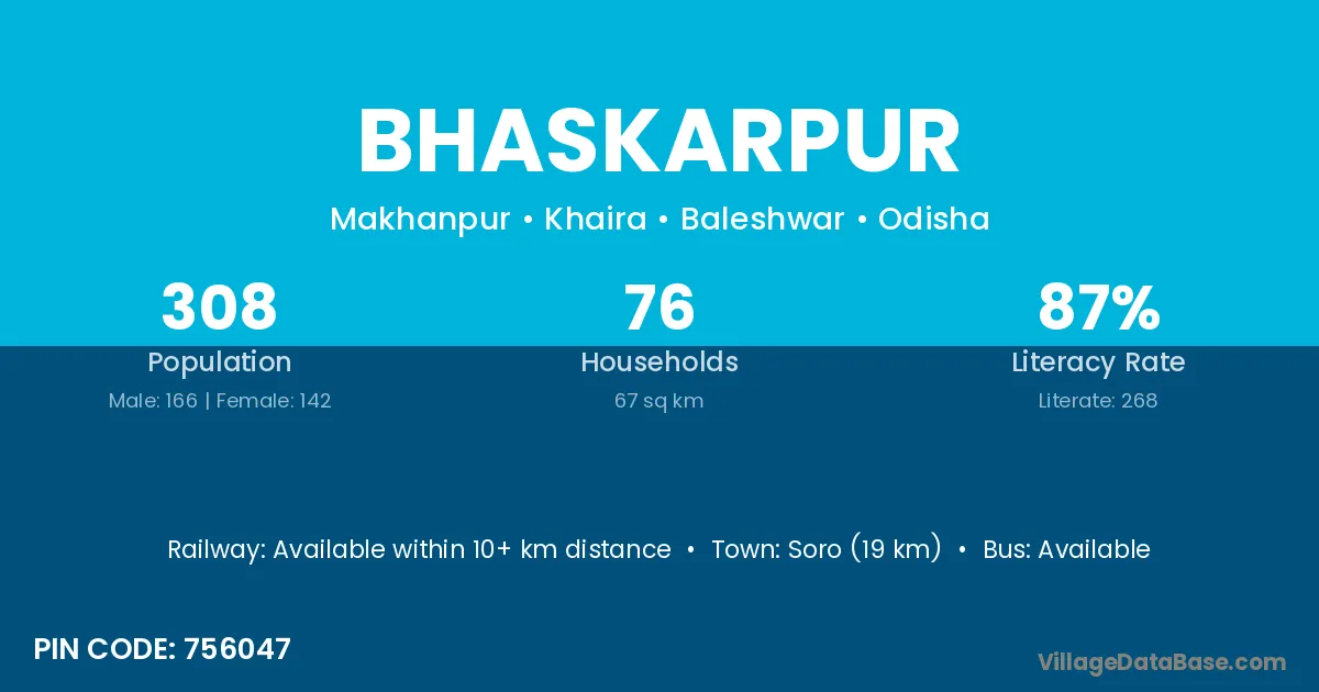 Soro (19 km) is the nearest town to Bhaskarpur village for major economic activities and is located approximately 19 km away.