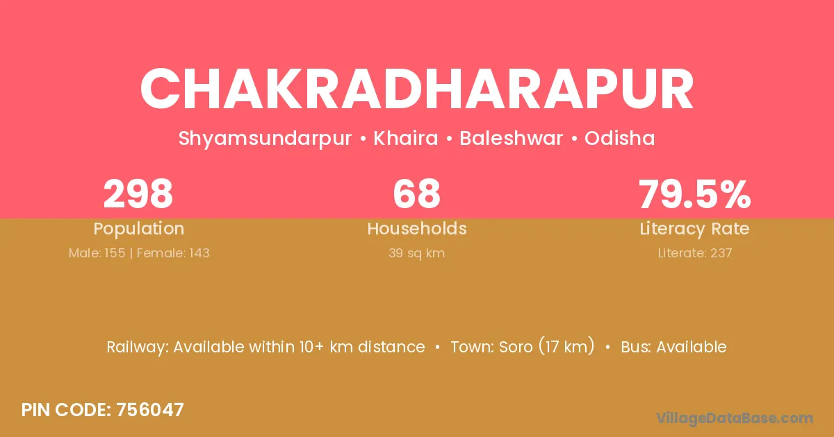 Soro (17 km) is the nearest town to Chakradharapur village for major economic activities and is located approximately 17 km away.