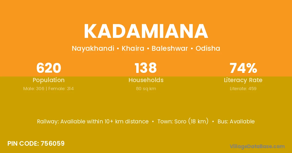 Kadamiana village has a total population of 620 people, of which 306 are males and 314 are females.