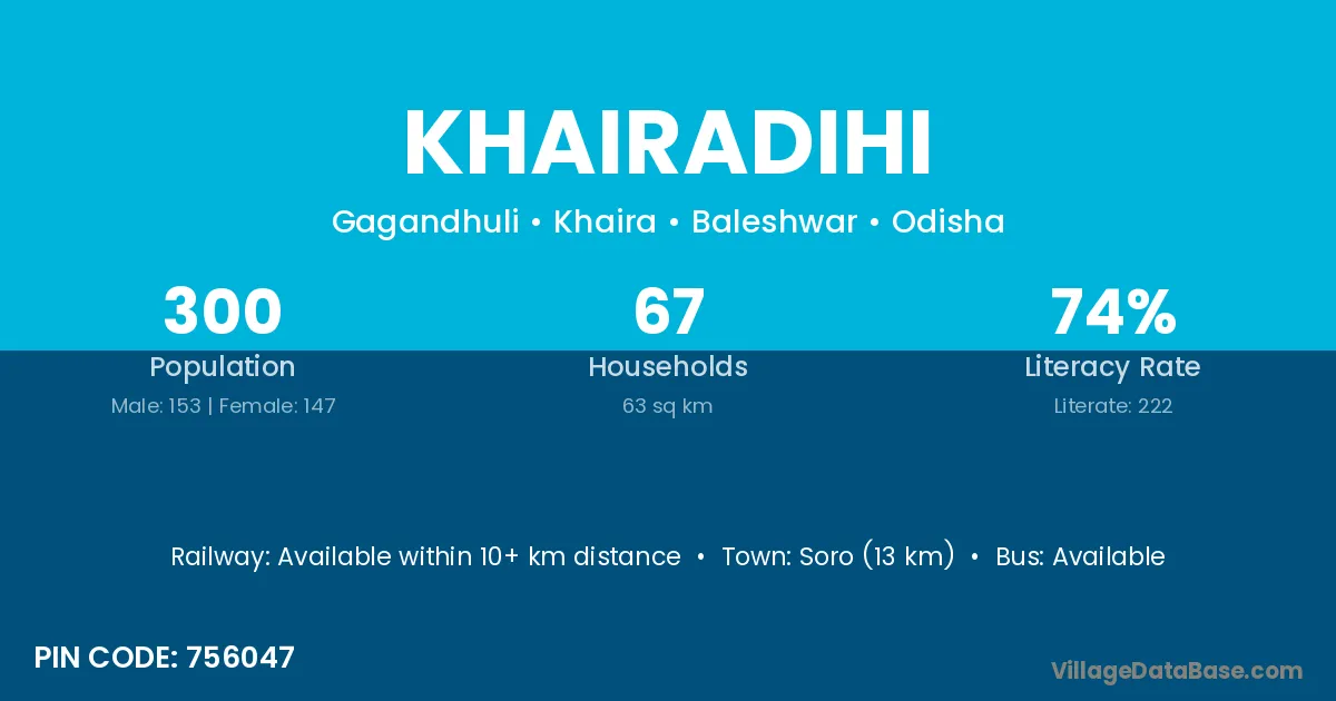 Soro (13 km) is the nearest town to Khairadihi village for major economic activities and is located approximately 13 km away.