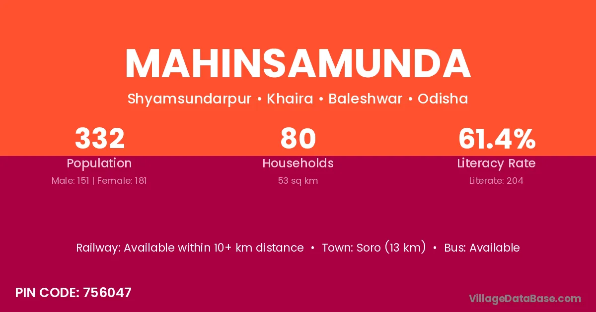 Soro (13 km) is the nearest town to Mahinsamunda village for major economic activities and is located approximately 13 km away.
