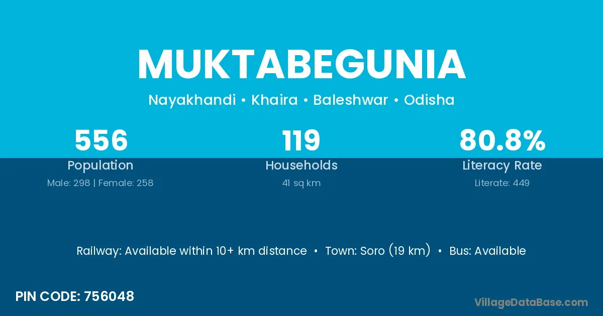 Soro (19 km) is the nearest town to Muktabegunia village for major economic activities and is located approximately 19 km away.