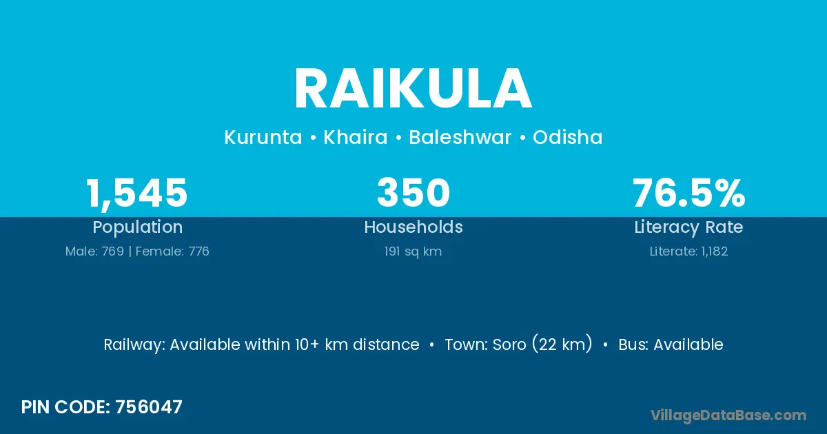 Soro (22 km) is the nearest town to Raikula village for major economic activities and is located approximately 22 km away.