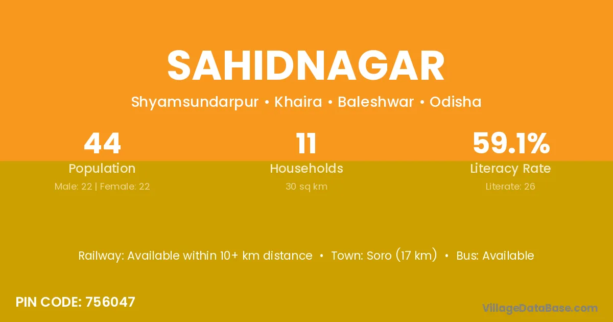 Soro (17 km) is the nearest town to Sahidnagar village for major economic activities and is located approximately 17 km away.