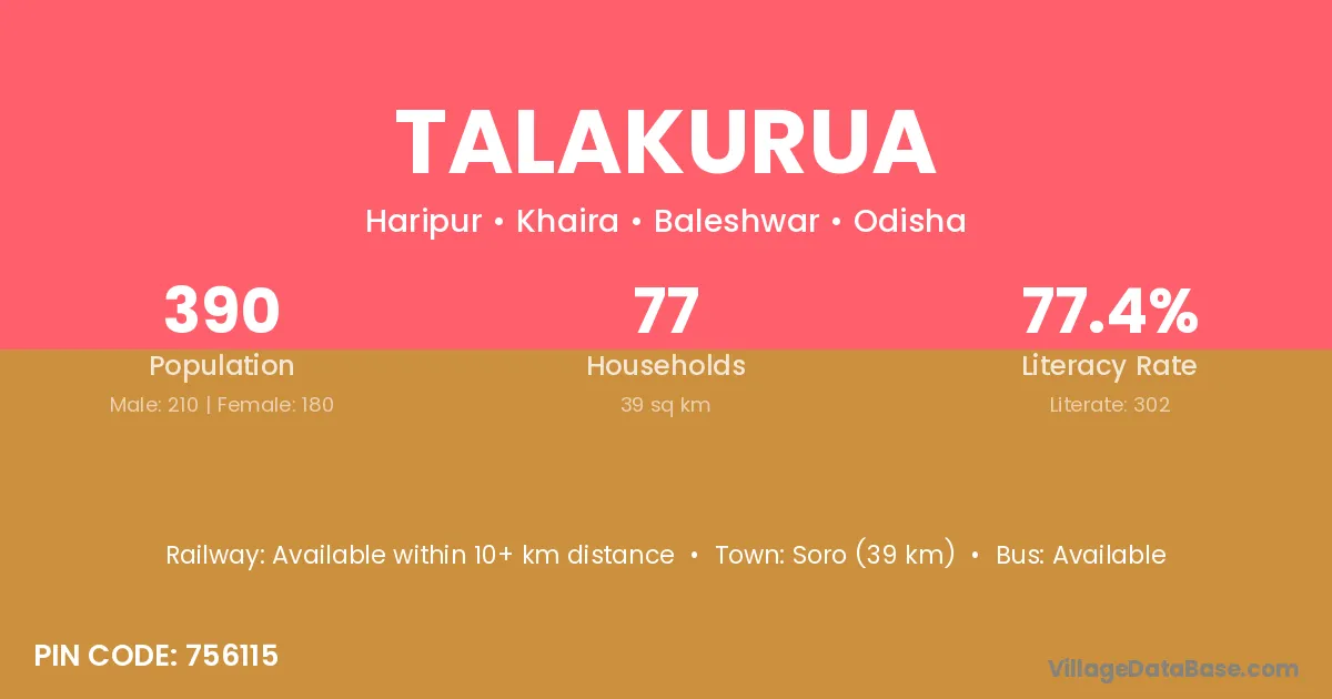 Soro (39 km) is the nearest town to Talakurua village for major economic activities and is located approximately 39 km away.