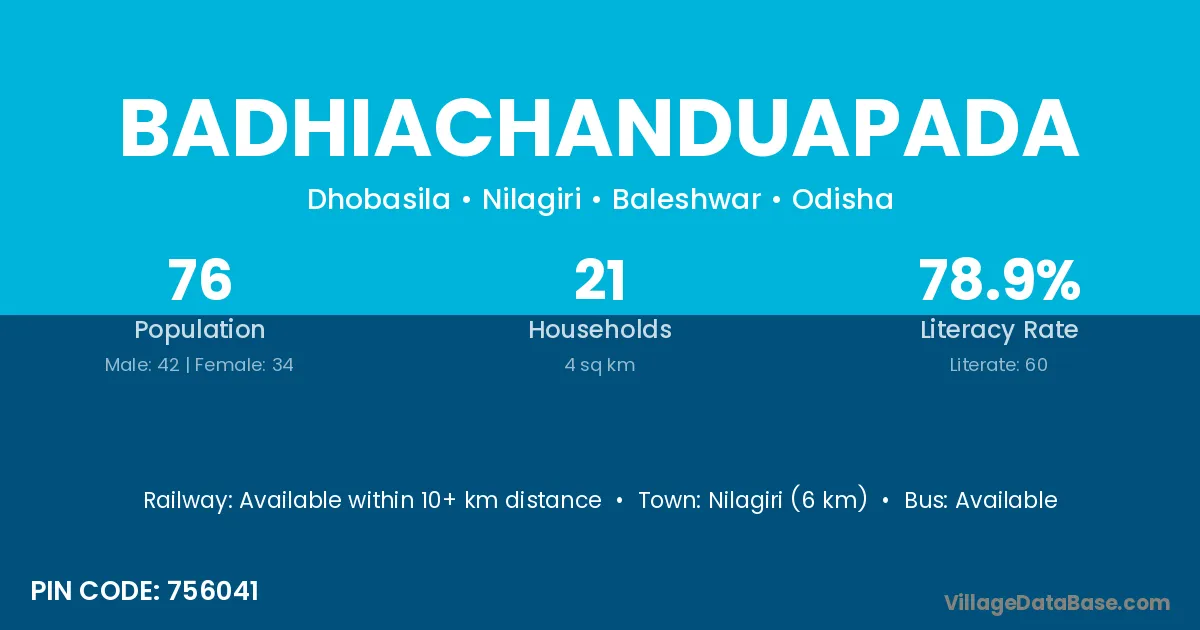 Nilagiri (6 km) is the nearest town to Badhiachanduapada village for major economic activities and is located approximately 6 km away.