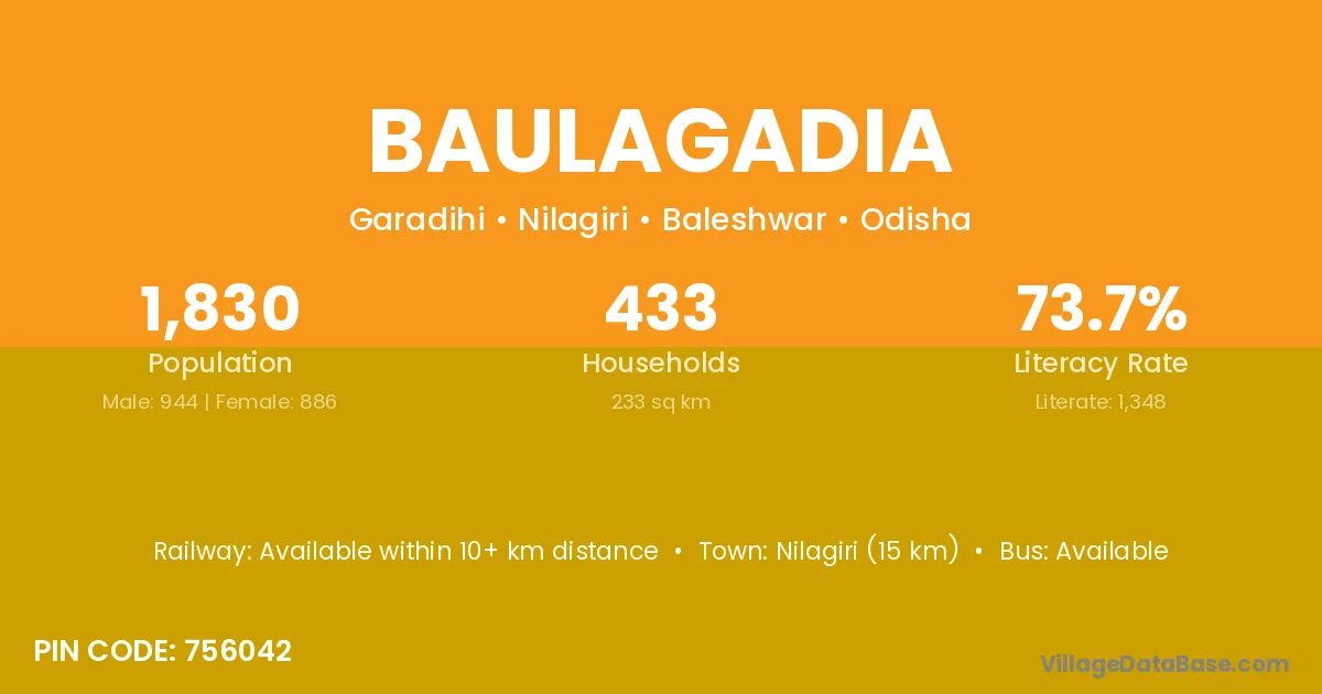 Nilagiri (15 km) is the nearest town to Baulagadia village for major economic activities and is located approximately 15 km away.