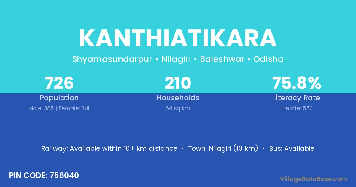 Kanthiatikara village has a total population of 726 people, of which 385 are males and 341 are females.