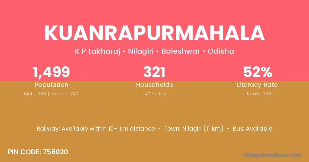 Nilagiri (11 km) is the nearest town to Kuanrapurmahala village for major economic activities and is located approximately 11 km away.
