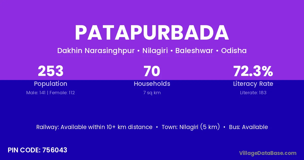 Nilagiri (5 km) is the nearest town to Patapurbada village for major economic activities and is located approximately 5 km away.